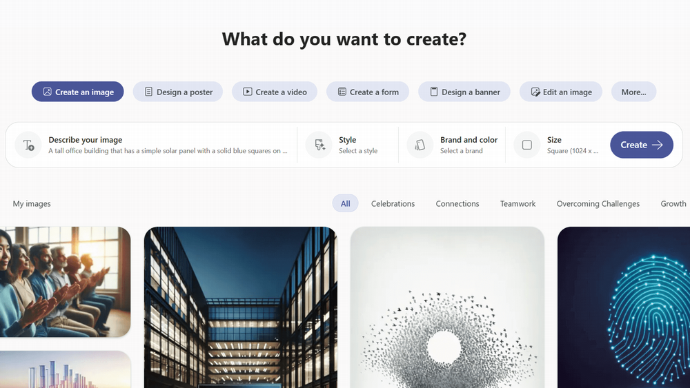 Create is an AI-powered workspace within Copilot for Microsoft 365 that helps you generate content such as videos, images, documents, designs, and other creative assets using natural language prompts.